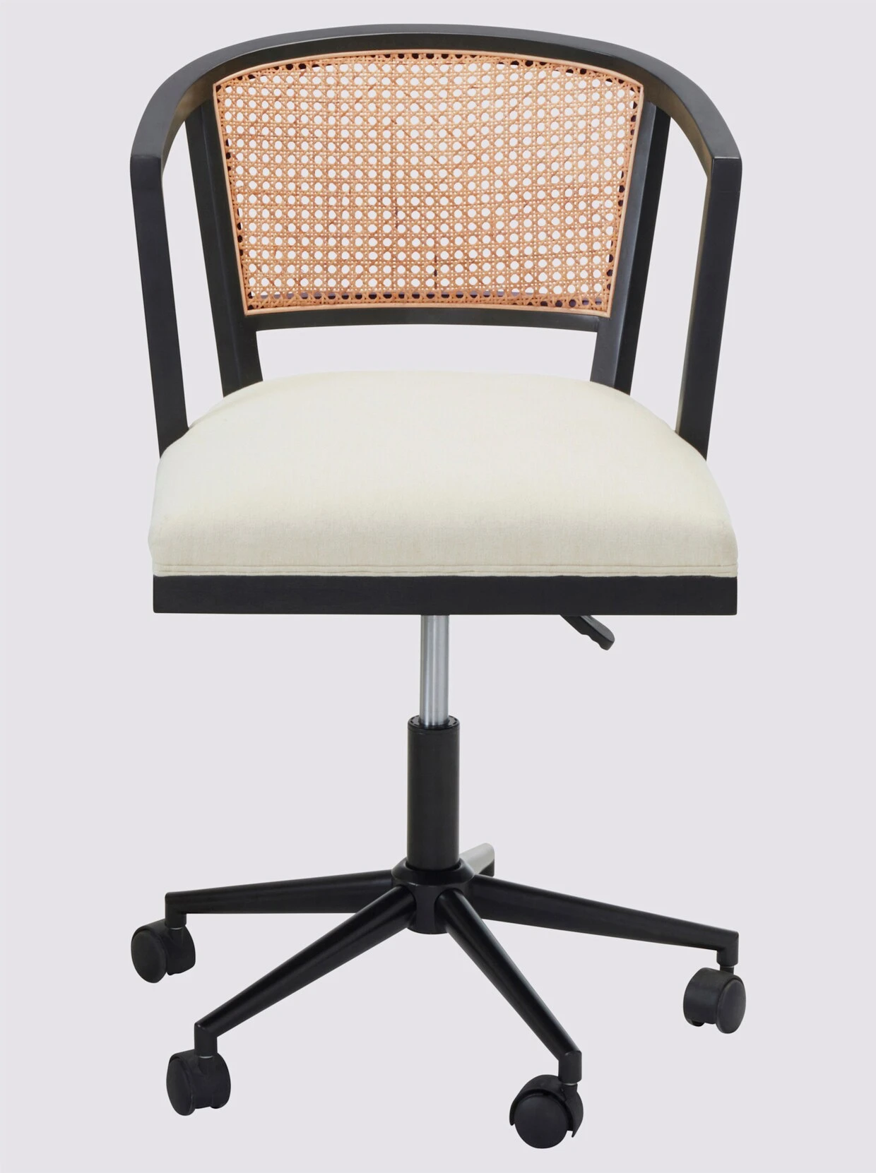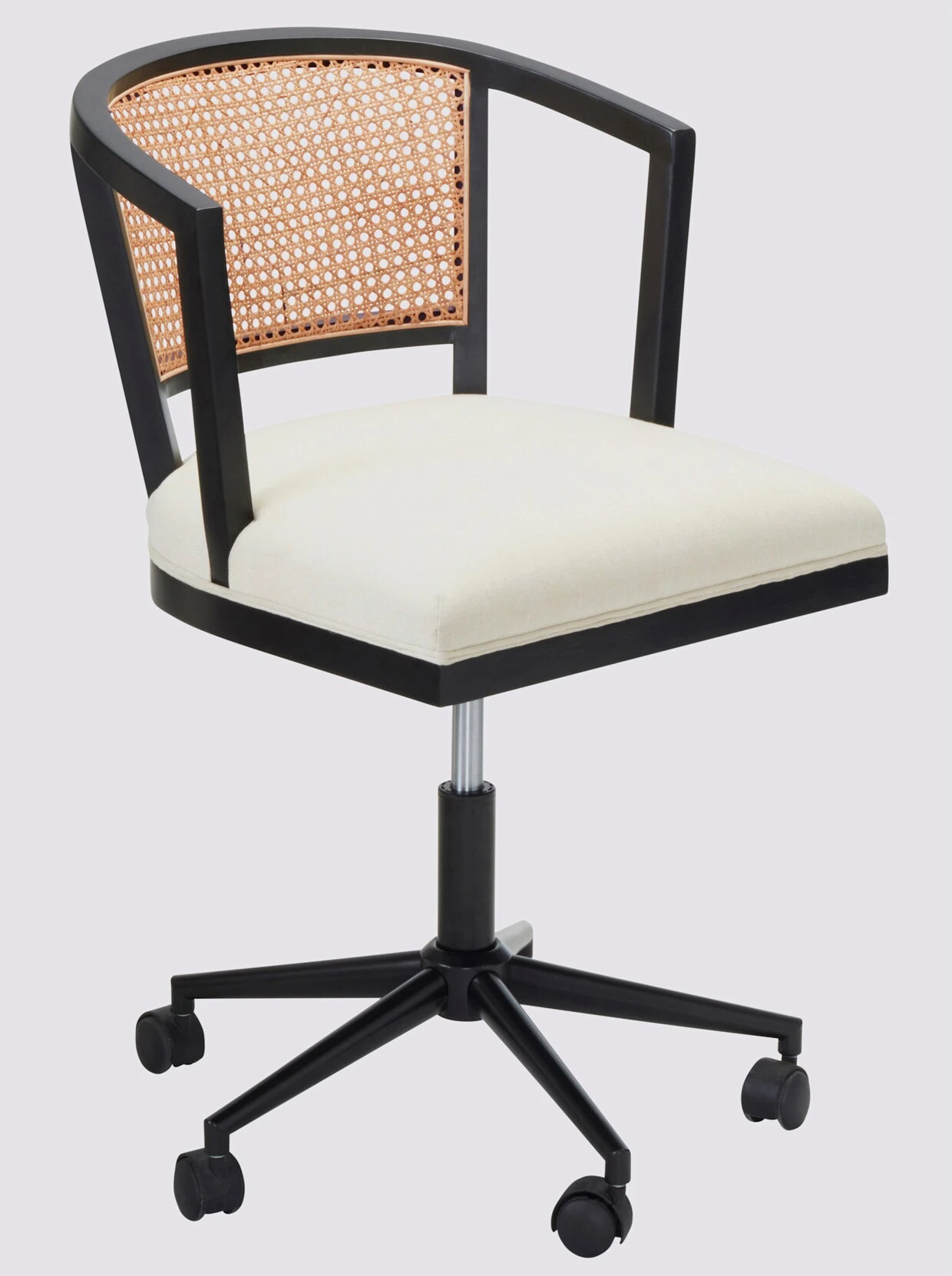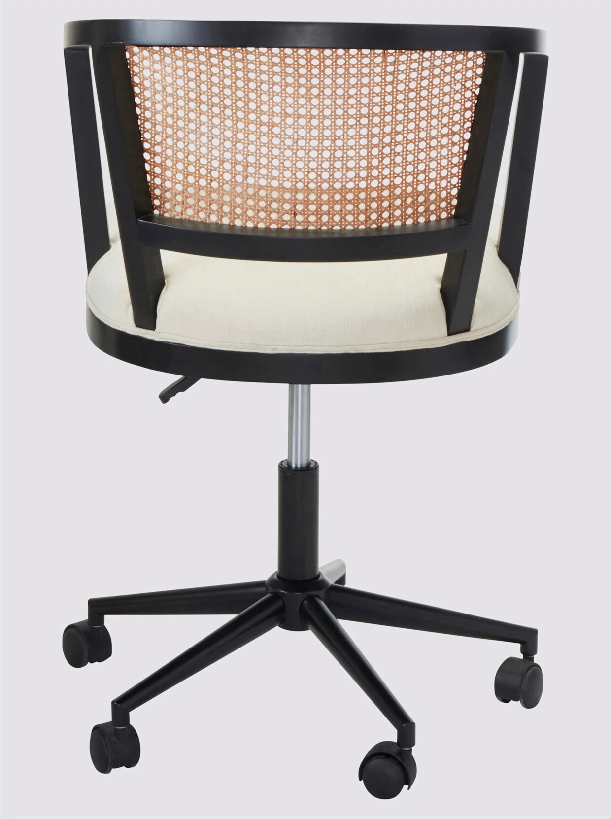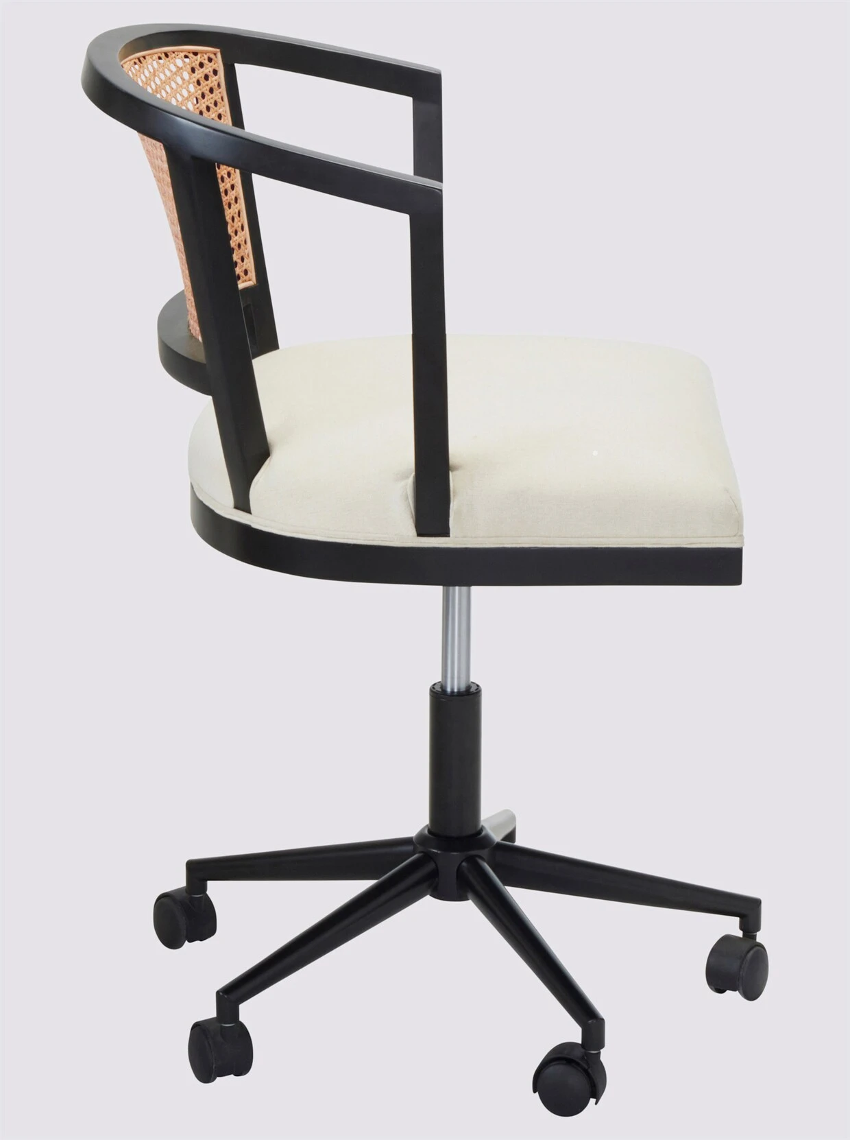 Schreibtischstuhl Bezug aus Polyester. Fester Schaumstoffkern. Rückenlehne mit Bastgeflecht. Füße aus Metall, schwarz lackiert. Auf 5 Rollen. Sitzhöhe variabel verstellbar, min. ca. 49 cm, max. ca. 59 cm. Sitz-B/T ca. 46/49 cm. Teilmontage.